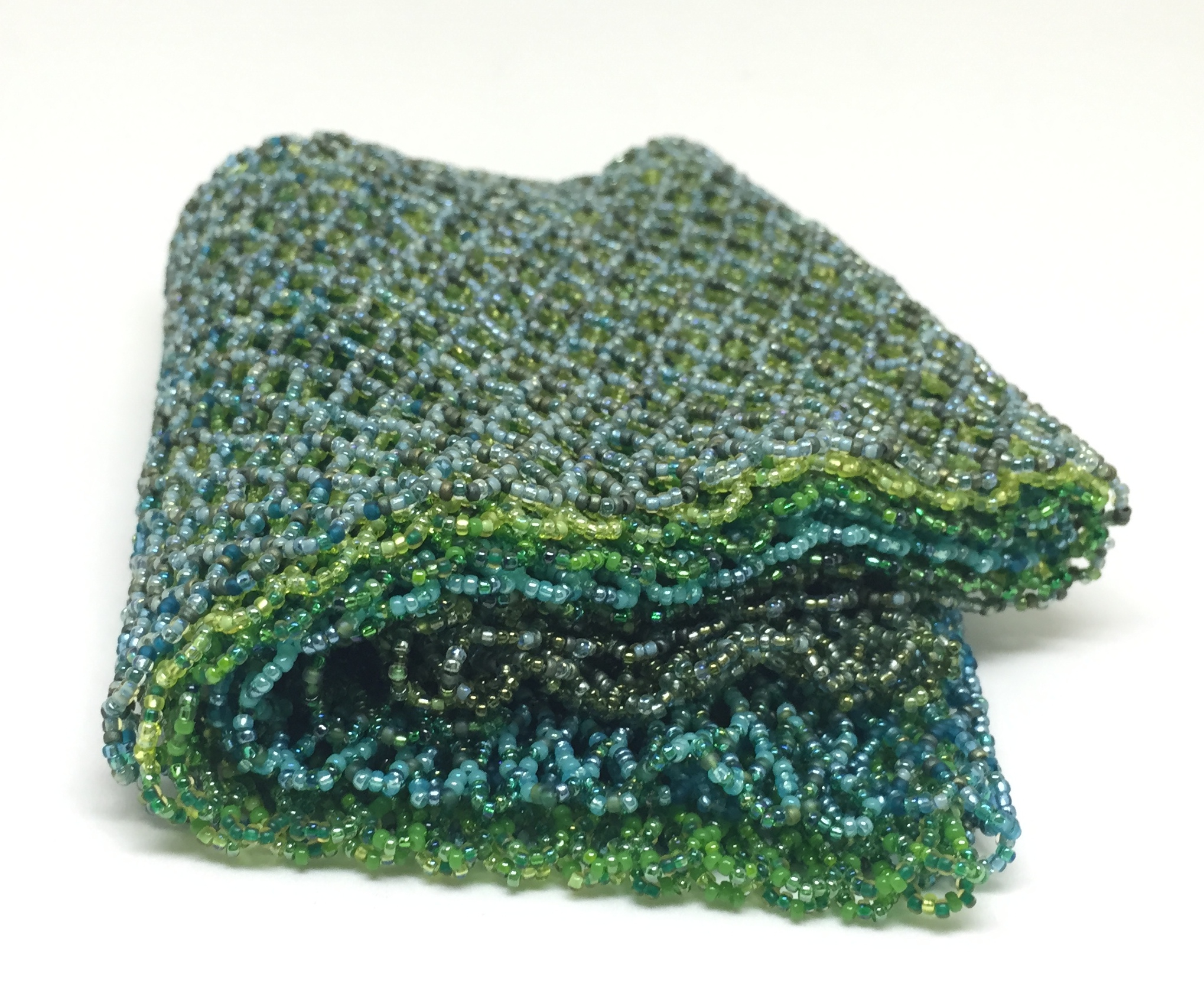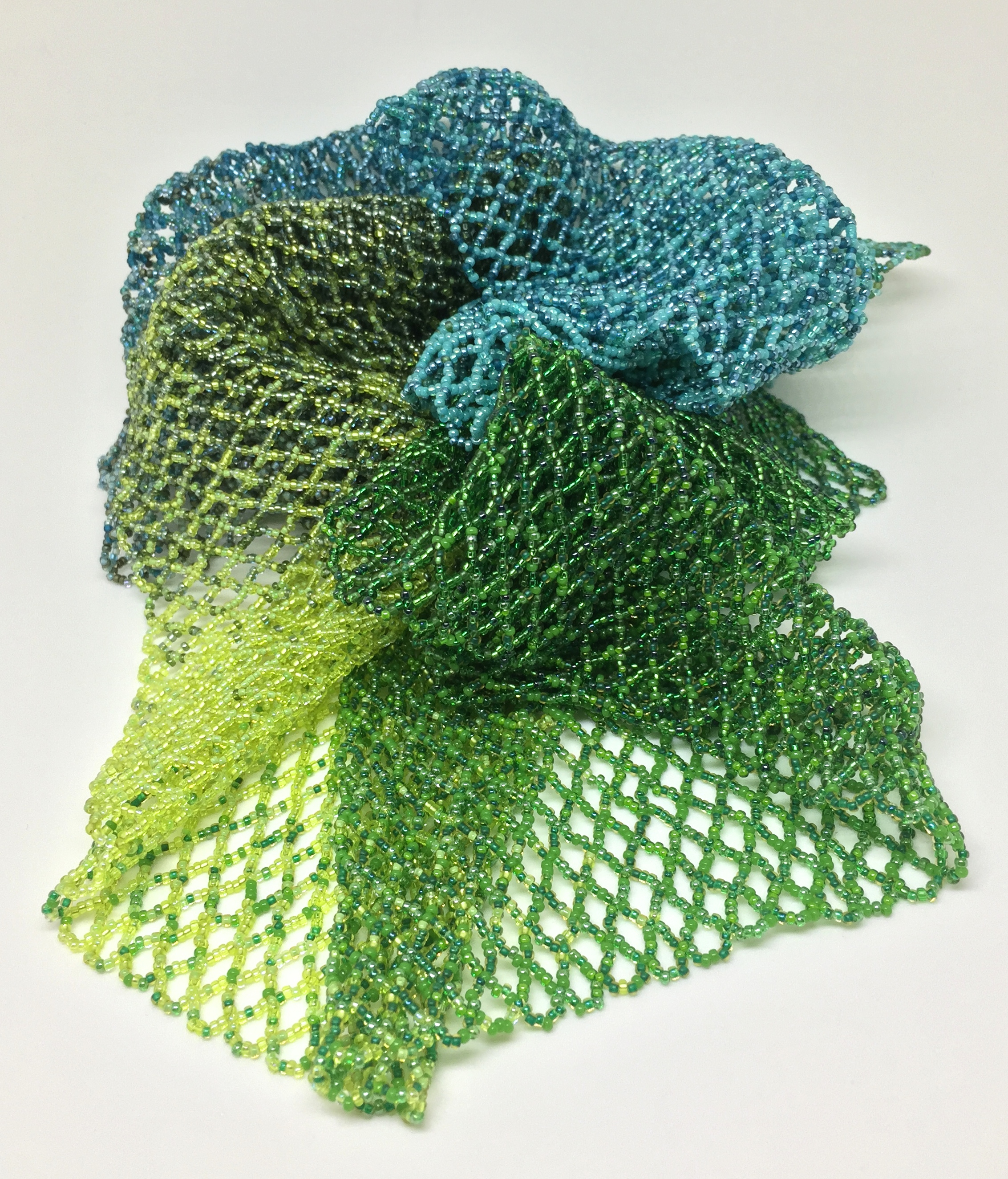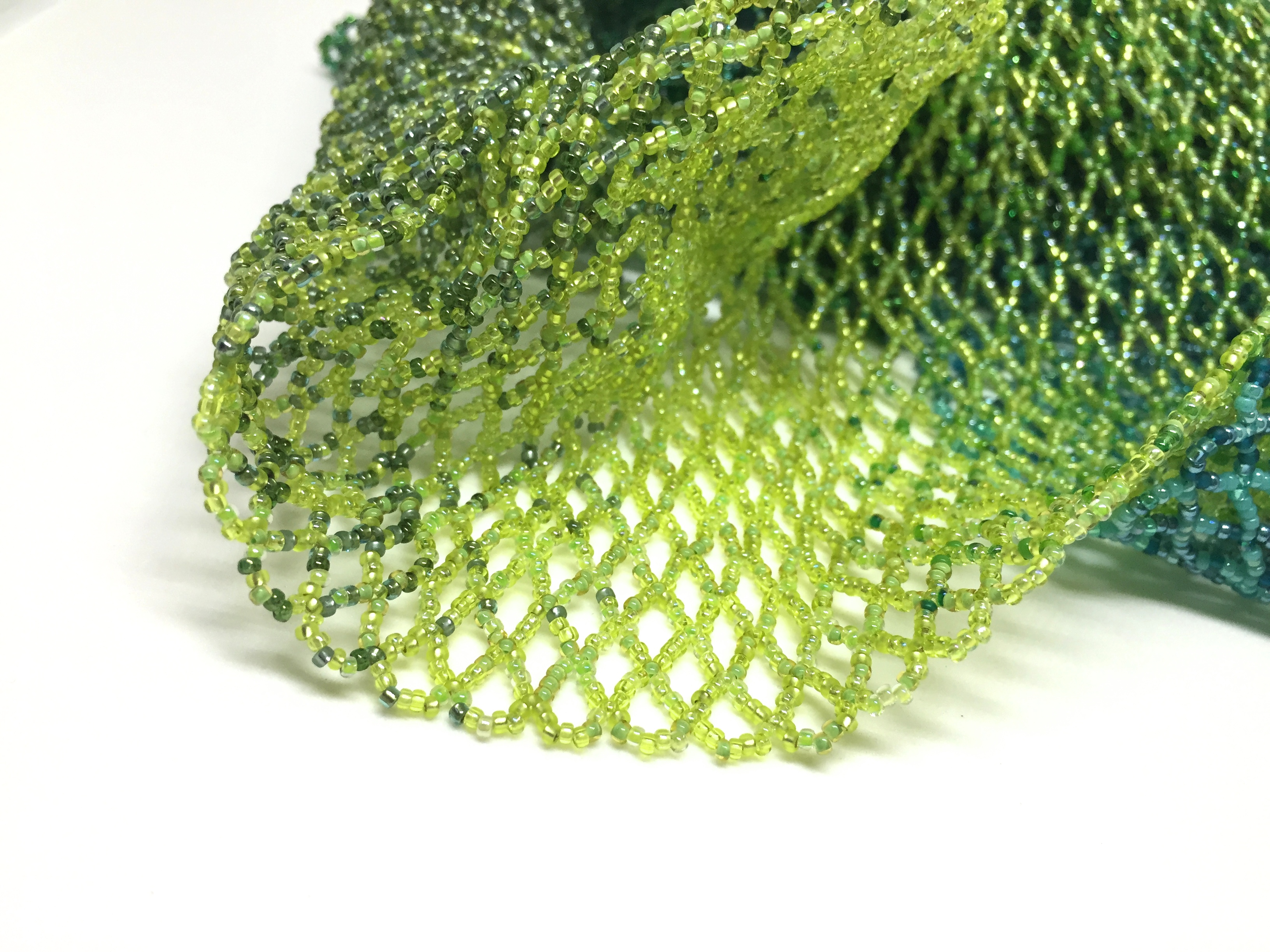 This scarf is made from tens of thousands of small seed beads, in a range of green colors. When traveling, I love to see the changing shades of green going from one place to another.