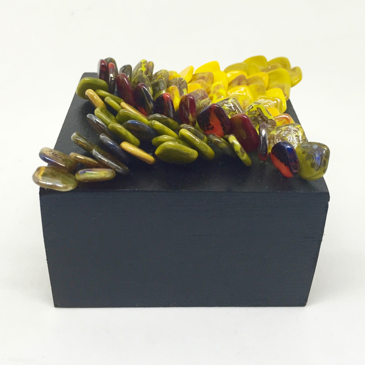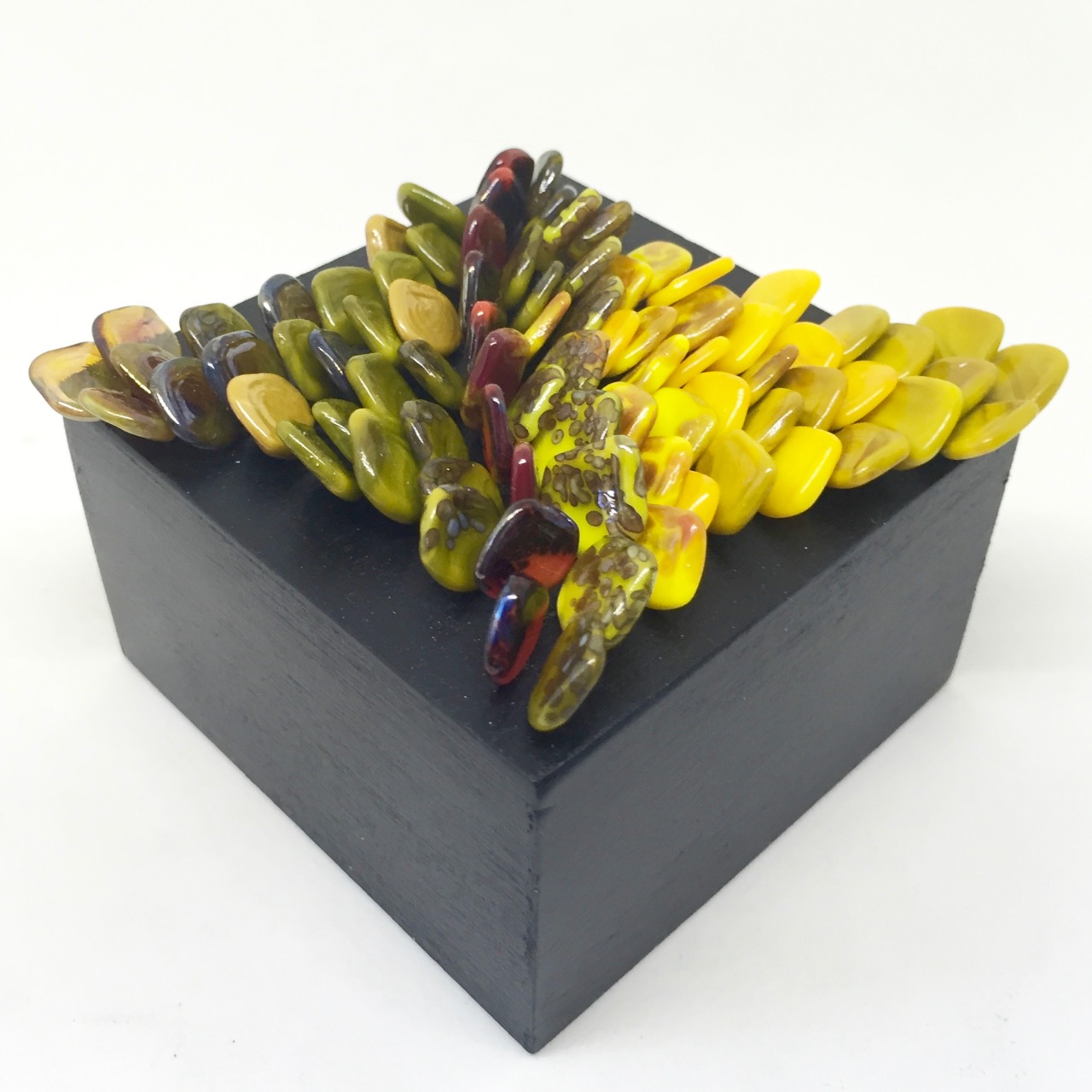 In graduating colors this glass sculpture shows an organic formation representing scales. It is made with dozens of individually made glass headpins in a wooden base. The base is 7 by 7 cm.