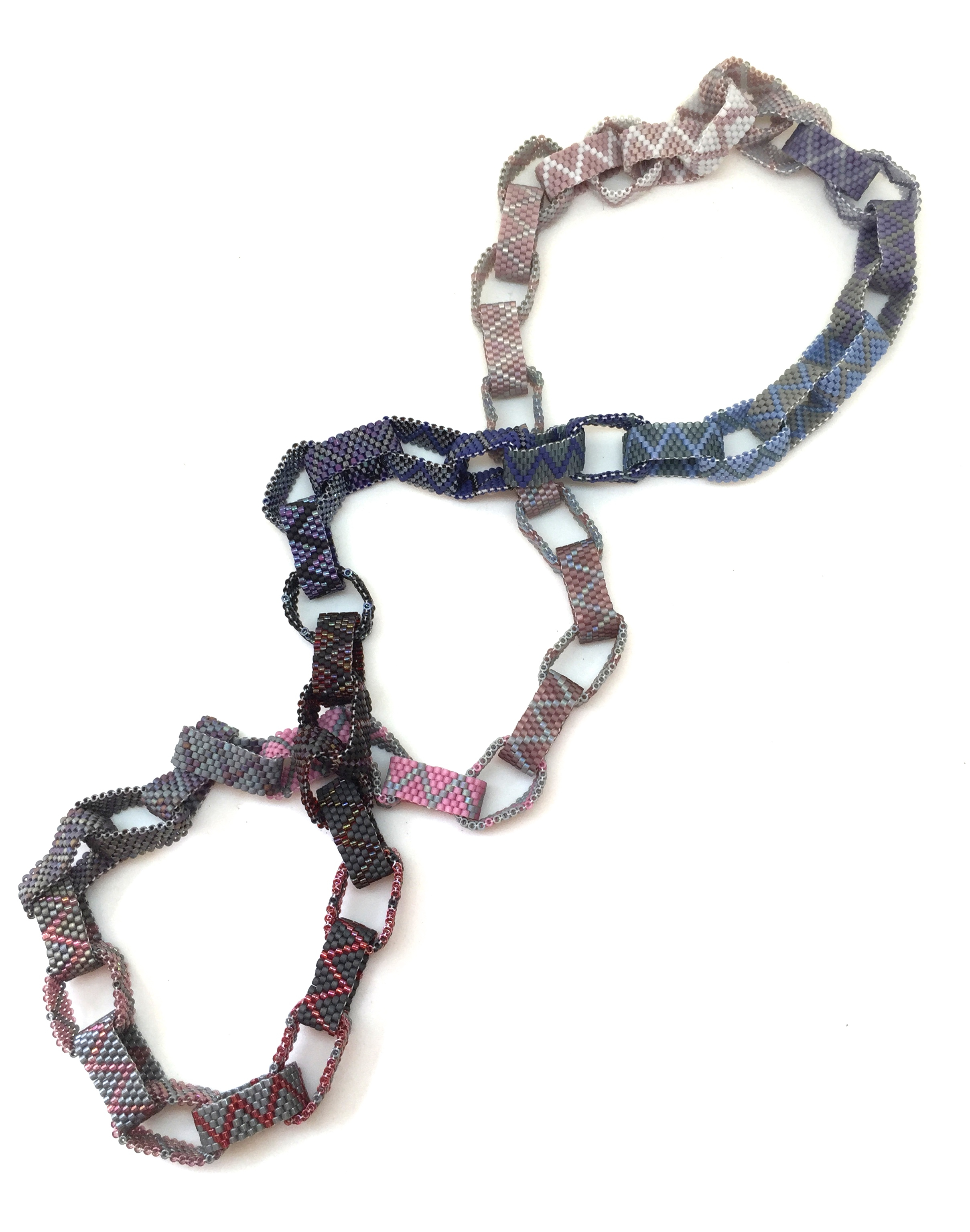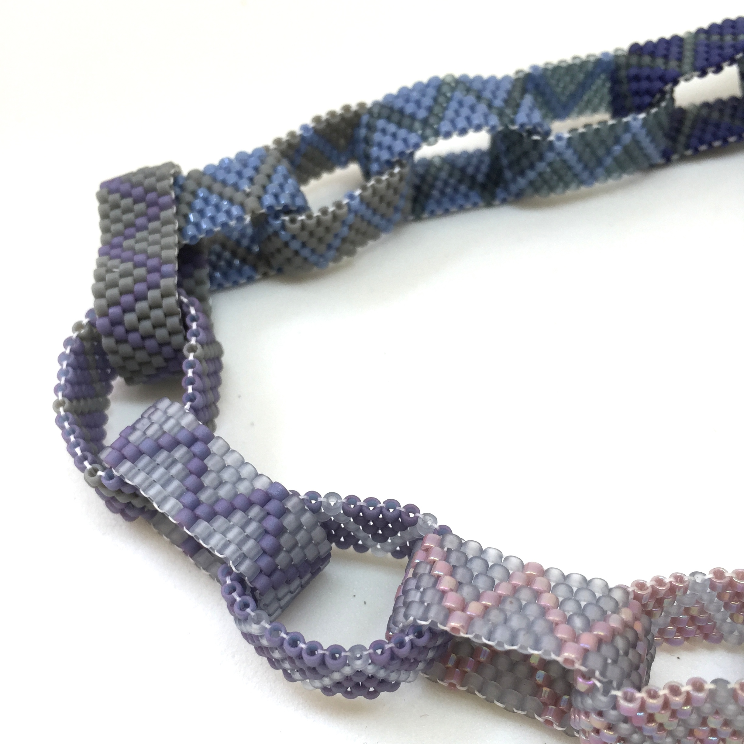 This necklace is made from loops in different shades of purple.